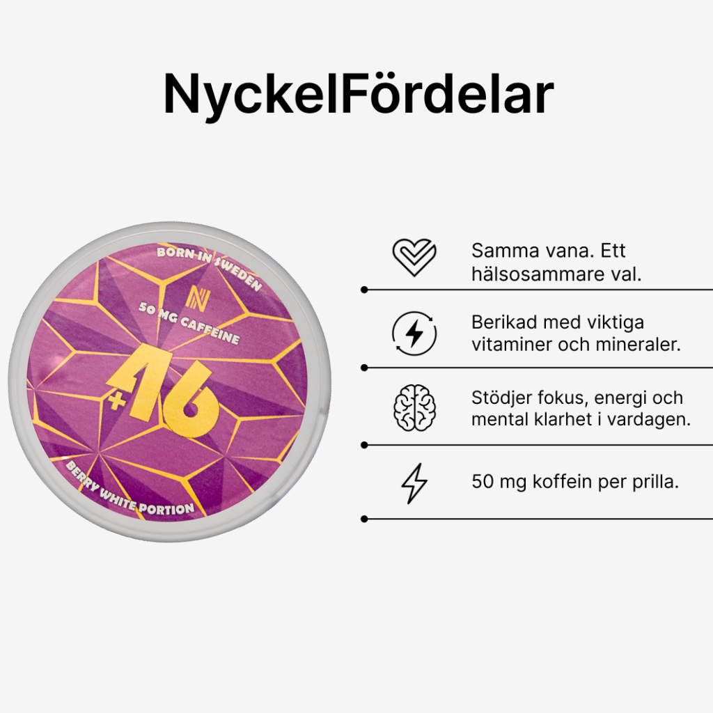 +46 är en snusliknande energipåse, helt fri från tobak och nikotin. Varje prilla innehåller 50 mg koffein samt utvalda vitaminer och mineraler som ger dig en jämn och stabil energiboost. Placera den under läppen precis som vanligt snus och känn effekten inom några minuter!